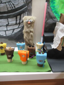 寿司の大皿・トイレットペーパーの芯・ペットボトル・空き缶・段ボールなどなど、捨てるはずの物を使った作品が多くあります。カッコ良さも見ていただきたいですが、生まれ変わった廃品たちも見つけてもらいたいです。