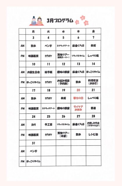 3月のデイケアプログラムです🎎
